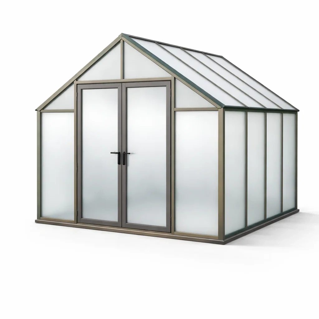 Rahmen aus pulverbeschichtetem Aluminium und Paneele aus 4 mm Polycarbonat.